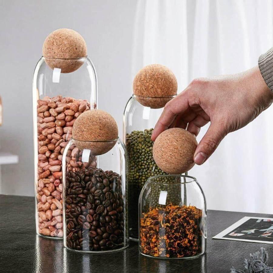 •نام محصول: بانکه شیشهای آشپزخانه با درب گرد چوبپنبهای