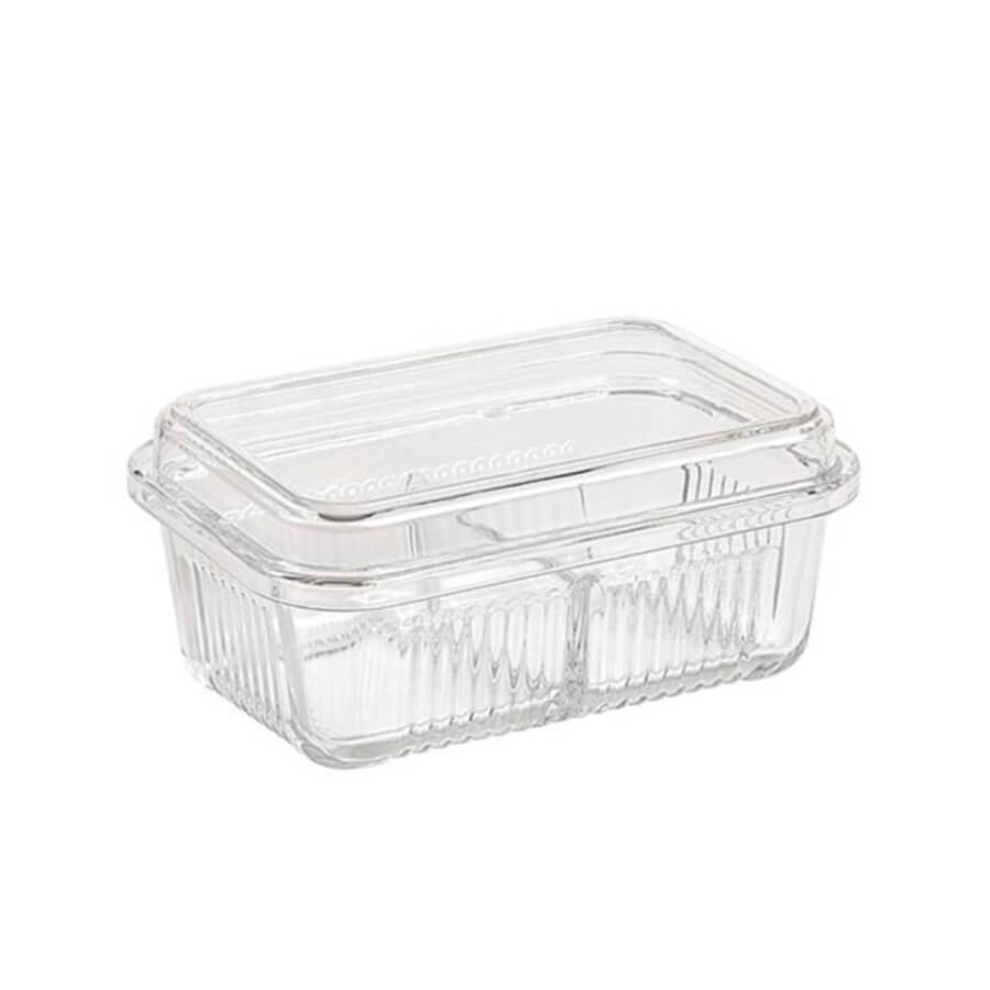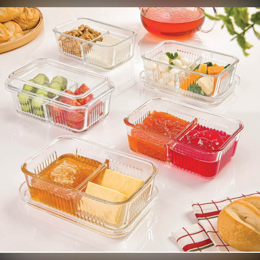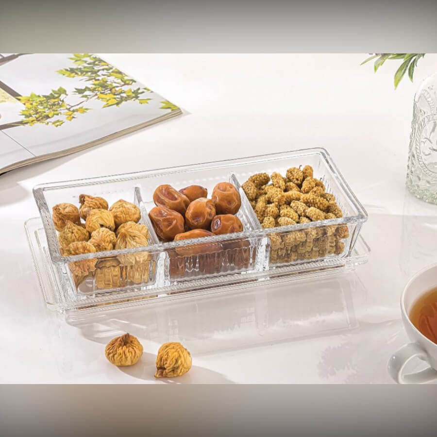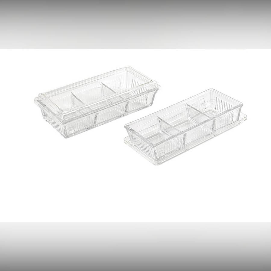 •نام محصول: ظرف شیشهای شیاردار چندبخشی با درب اکریلیک