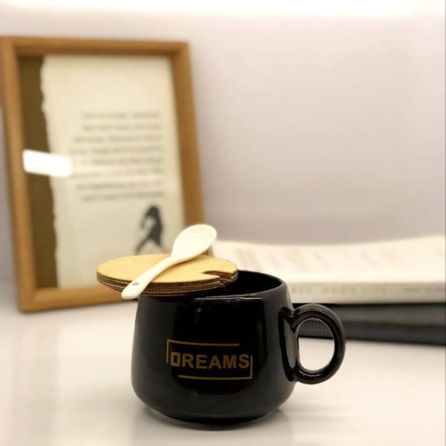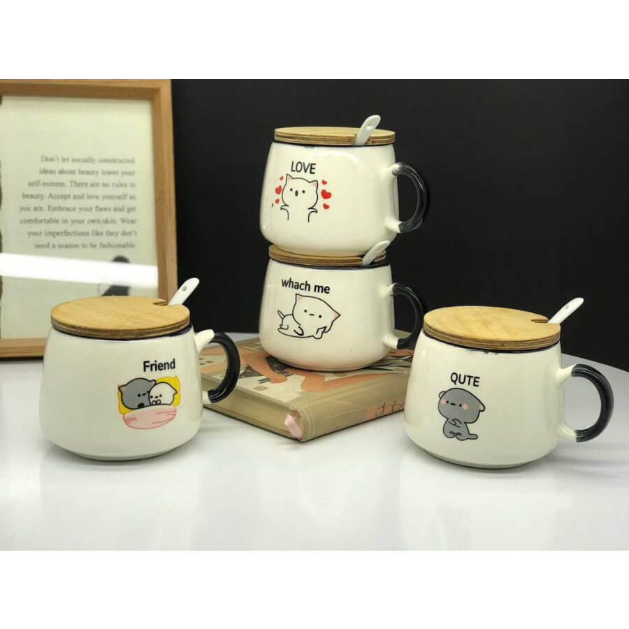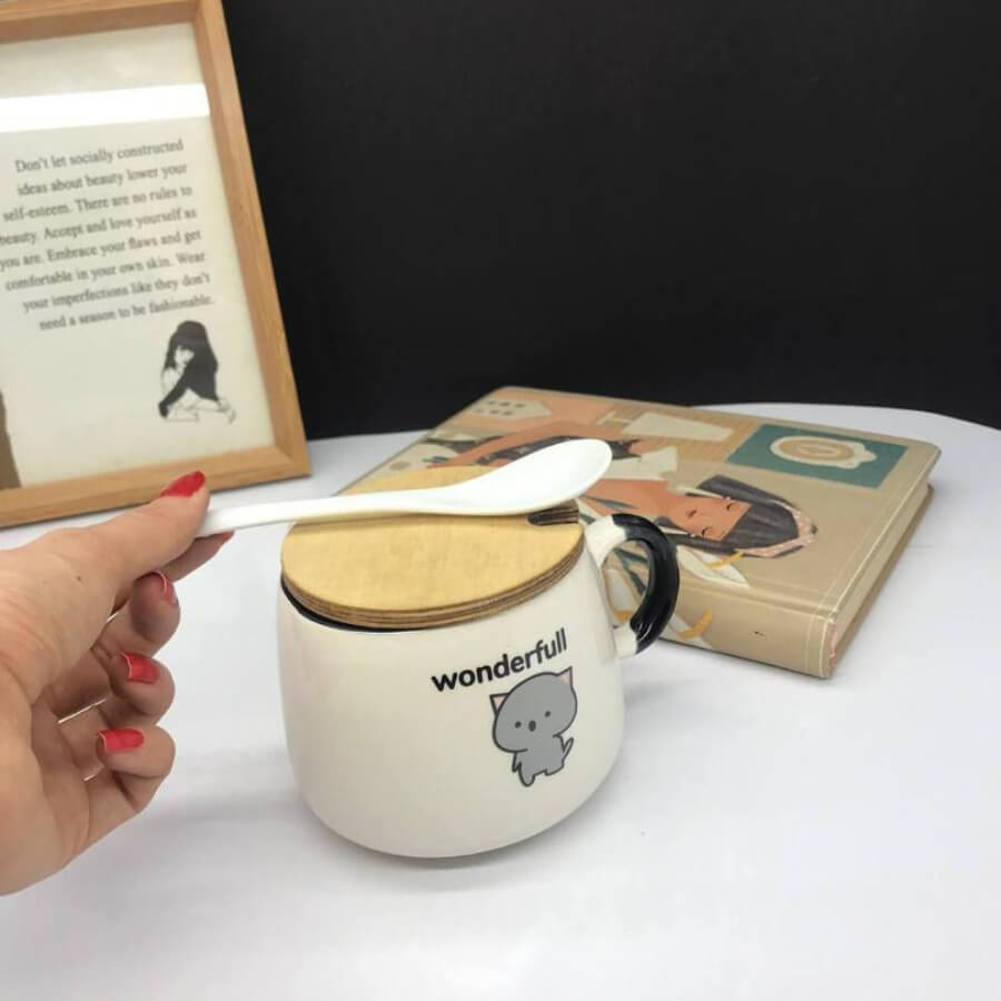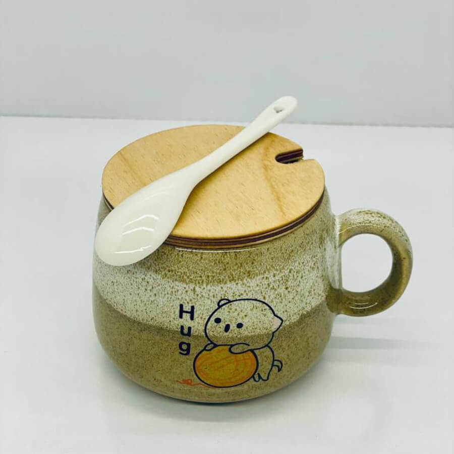 ماگ سرامیکی طرح‌دار با درب بامبو و قاشق سفید سرامیکی