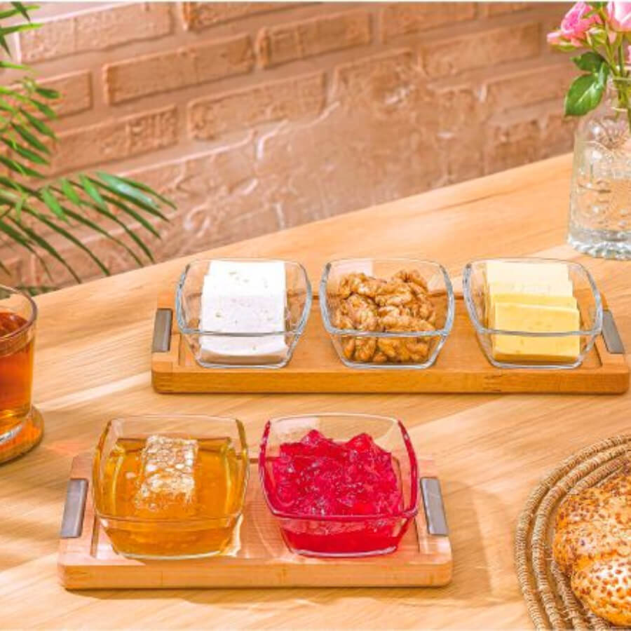 این اردوخوری از دو ظرف شیشه ای با کیفیت تشکیل شده است که روی پایه‌ای از چوب طبیعی قرار می‌گیرند. پایه چوبی، علاوه بر زیبایی، ثبات و استحکام لازم را فراهم می‌کند تا ظروف در جای خود محکم بمانند. طراحی دو‌تکه باعث می‌شود بتوانید انواع خوراکی‌ها را مانند ترشی، زیتون، سس یا آجیل به شکل منظم و شیک سرو کنید.